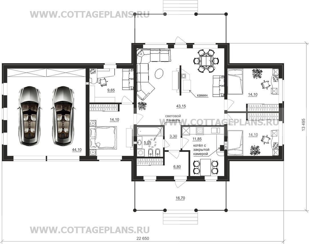 Проект дома 22-50 площадь 164.5 м2* из пеноблоков, газоблоков, одноэтажный, с пристроенным гаражом на 2 машины