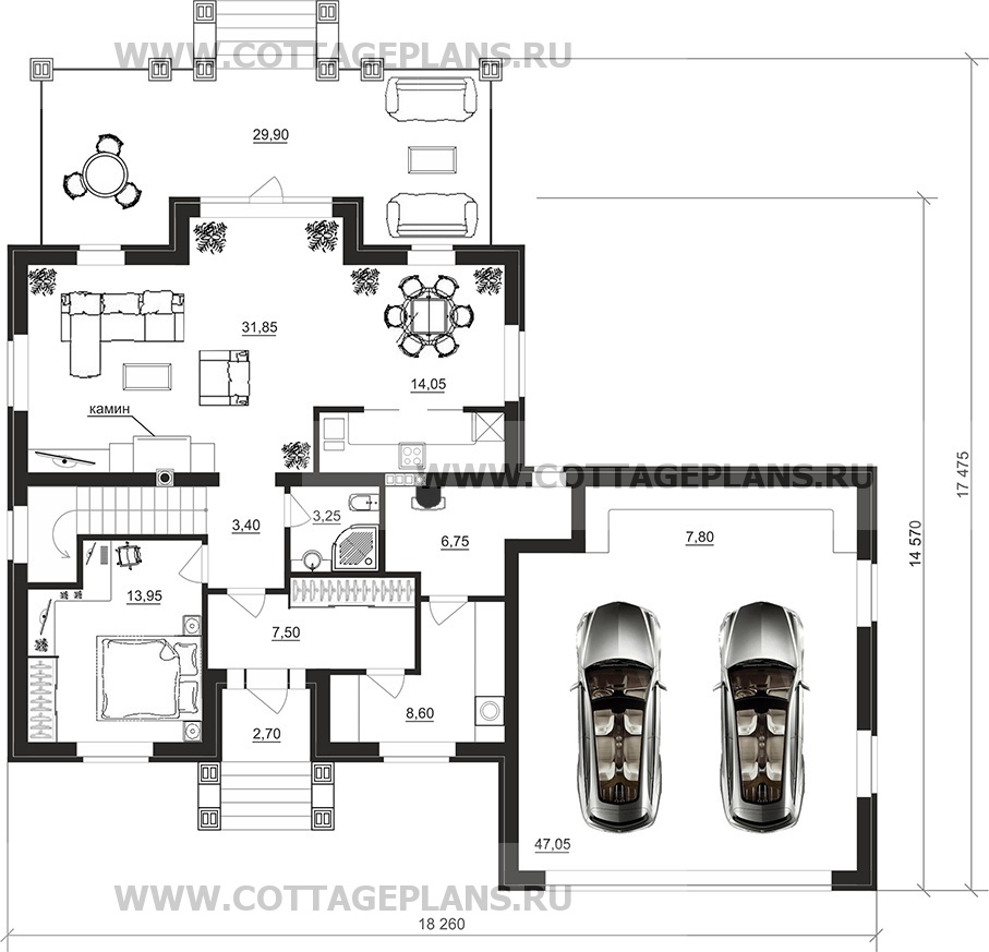 Проект дома 97-13 площадь 220.1 м2* из кирпича, керамических блоков, двухэтажный с полноценным вторым этажом, с пристроенным гаражом на 2 машины