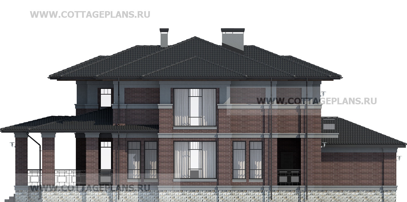 Проект дома 103-22 площадь 552.5 м2* из кирпича, керамических блоков, двухэтажный, с полноценным вторым этажом меньшей площади, чем первый этаж, с гаражом на две машины, выдвинутым вперед перед домом