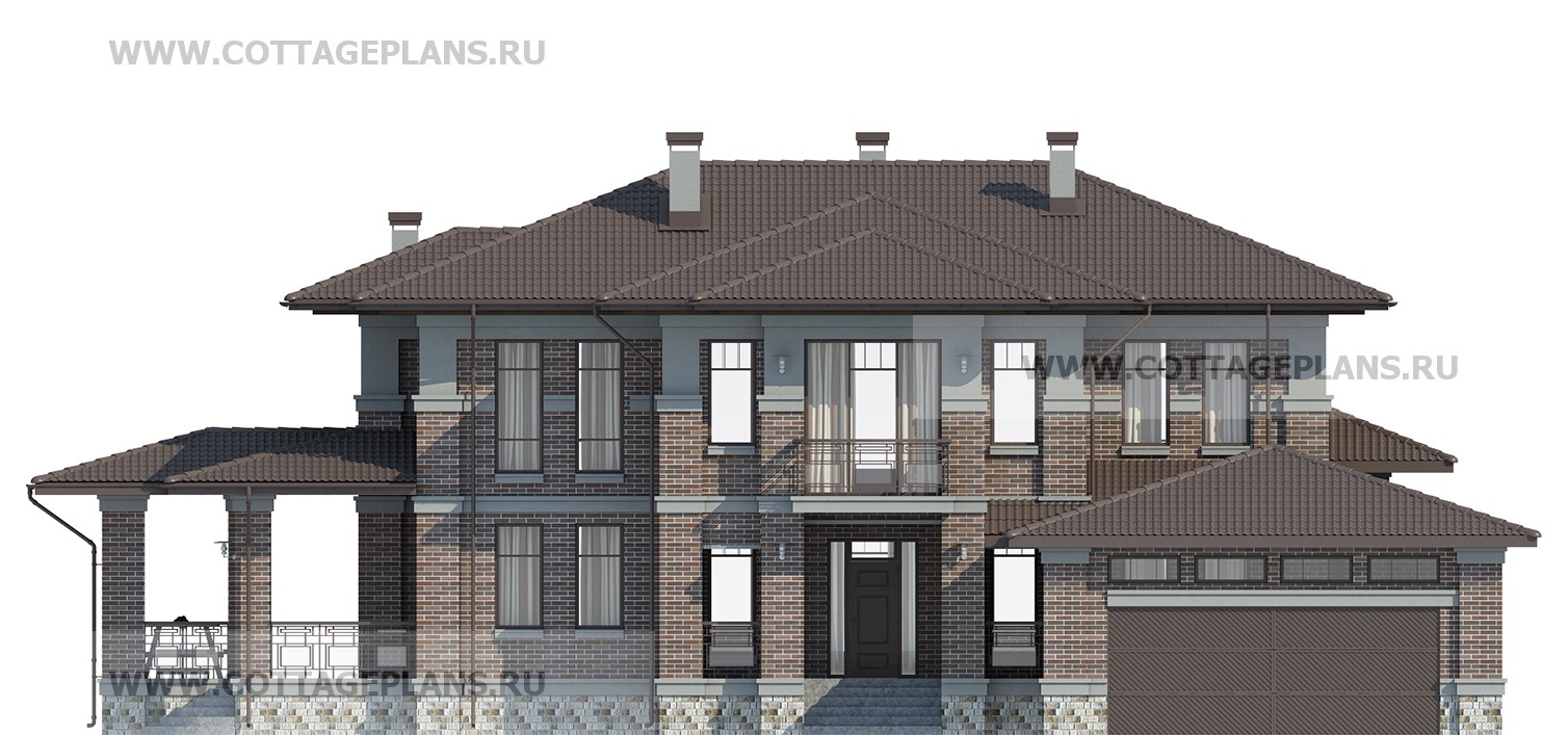 Проект дома 203-28 площадь 545.0 м2* из пеноблоков, газоблоков, двухэтажный, с полноценным вторым этажом меньшей площади, чем первый этаж, с гаражом на две машины, выдвинутым вперед перед домом