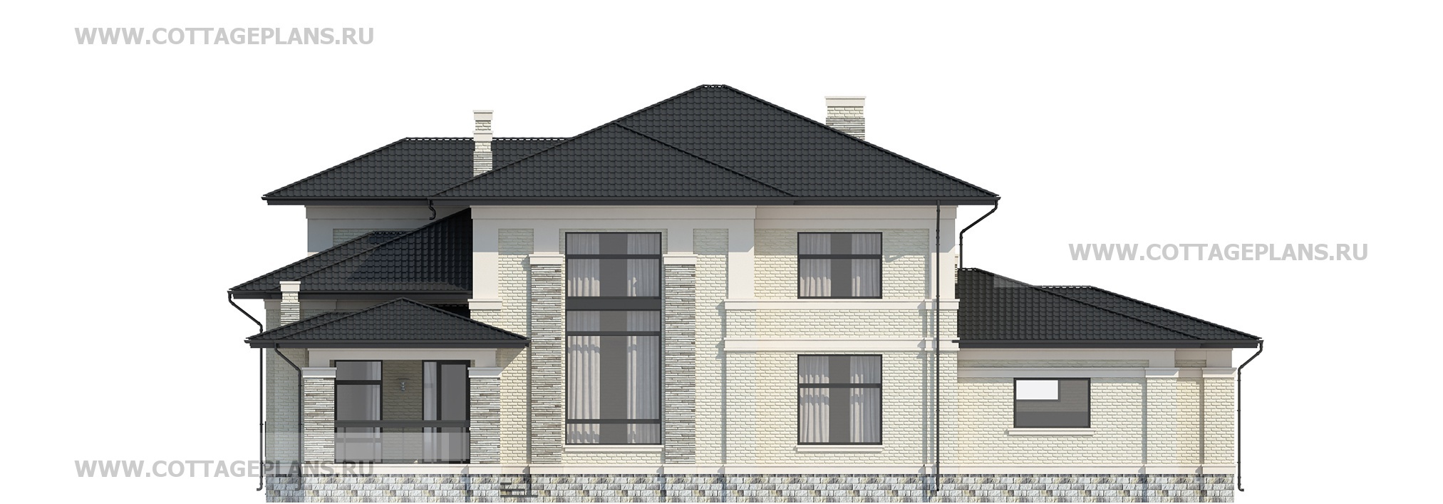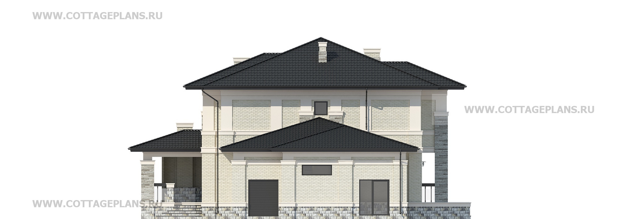 Проект дома 102-80 площадь 386.4 м2* из кирпича, керамических блоков, двухэтажный, с полноценным вторым этажом меньшей площади, чем первый этаж, с пристроенным гаражом на 2 машины