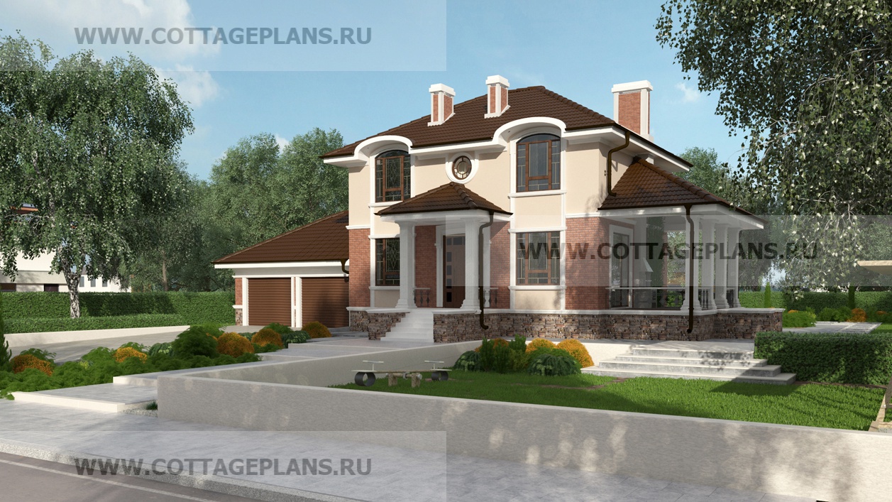 Проект дома 104-48 площадь 162.7 м2* из кирпича, керамических блоков, двухэтажный, с полноценным вторым этажом меньшей площади, чем первый этаж, с пристроенным гаражом на 2 машины