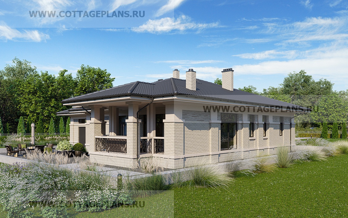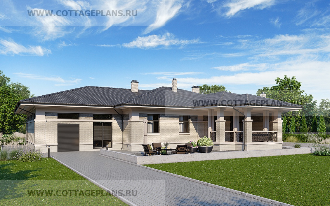 Проект дома 28-77 площадь 408.4 м2* из пеноблоков, газоблоков, одноэтажный, с пристроенным гаражом на 2 машины