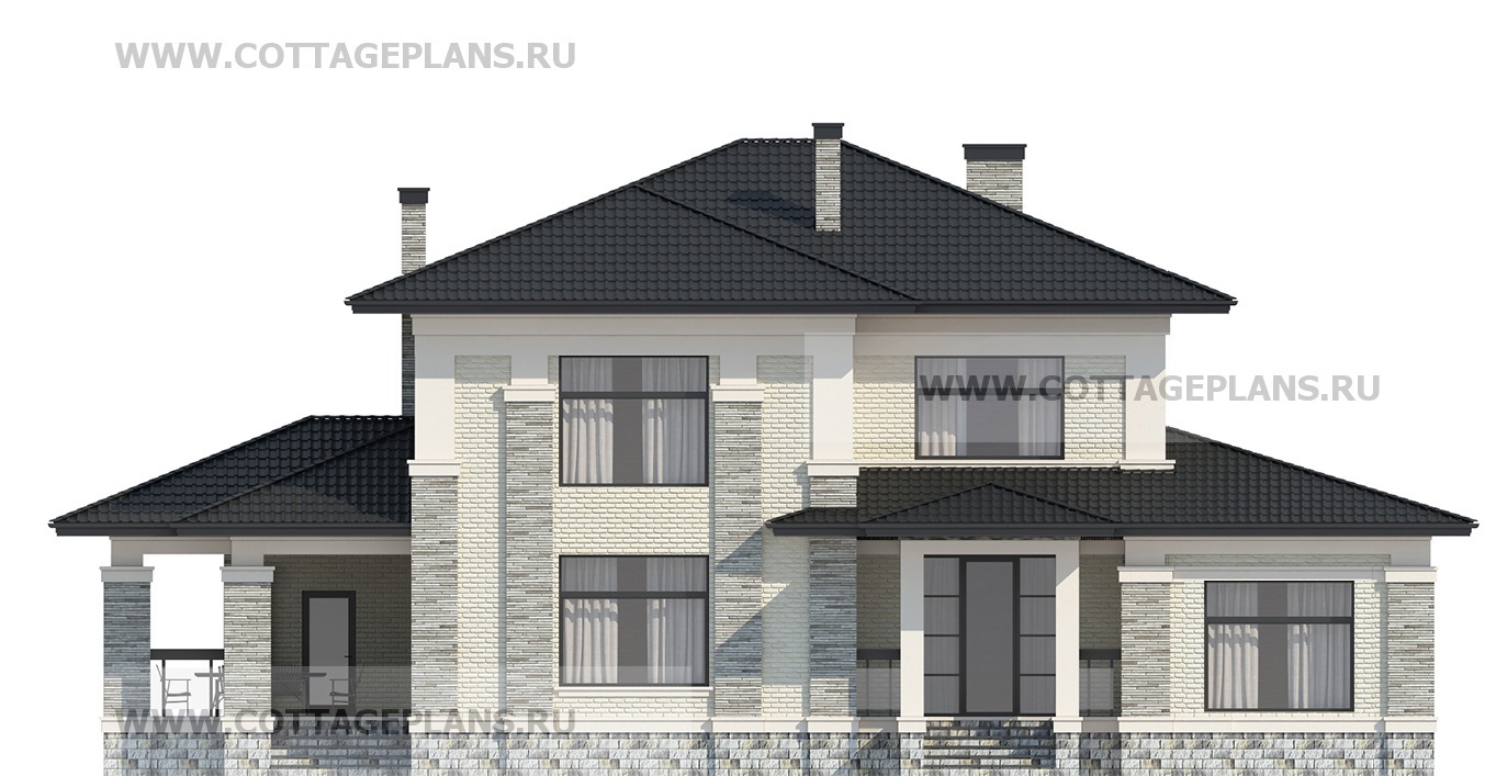 Проект дома 206-02 площадь 325.4 м2* из пеноблоков, газоблоков, двухэтажный, с полноценным вторым этажом меньшей площади, чем первый этаж, с семью спальнями